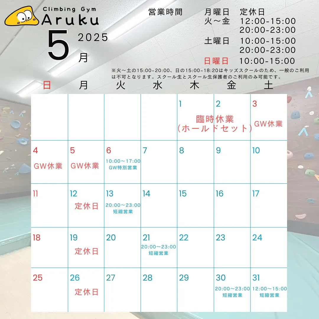 都城市・三股町でボルダリングを始めるなら『Aruku』!運動... 都城市・三股町でボルダリングを始めるなら『Aruku』!運動不足解消や体幹トレーニングにもぴったり!5月の営業時間スケジュールです!※5/1(木)〜5/5(月)まで休業となります。ご来店予定だった方、申し訳…